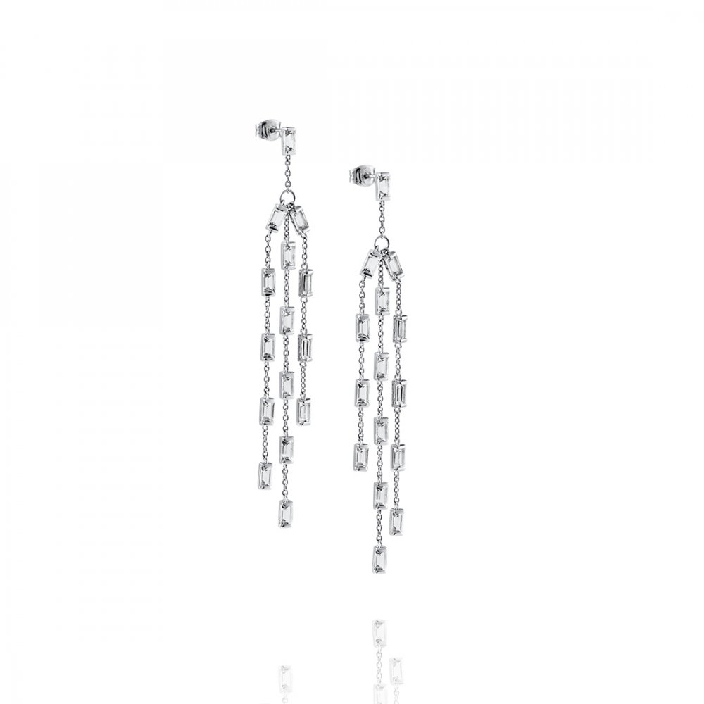 Statement örhängen i sterlingsilver med tre kedjor och tot. 30 baguetteslipade bergskristaller hängandes på kedjorna.