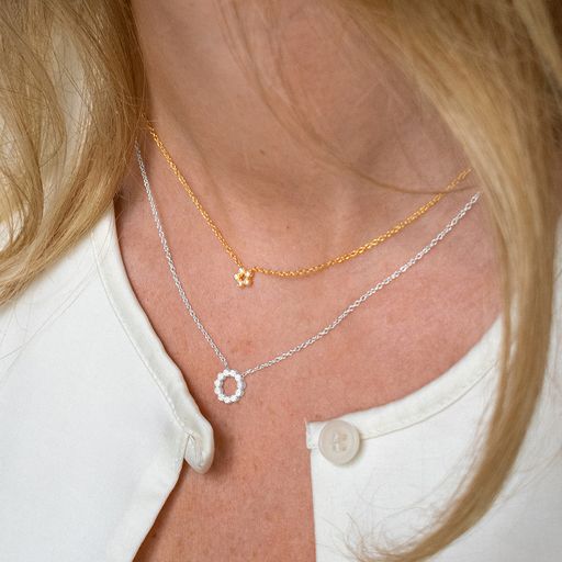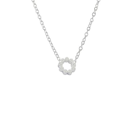 Ett minimalistiskt silverhalsband på en tunn kedja med en rund öppen cirkelform. Cirkeln har en prickig strukturerad yta som ger en vacker skimrande effekt.