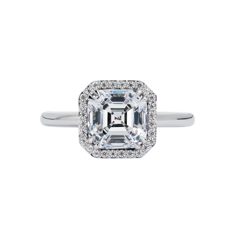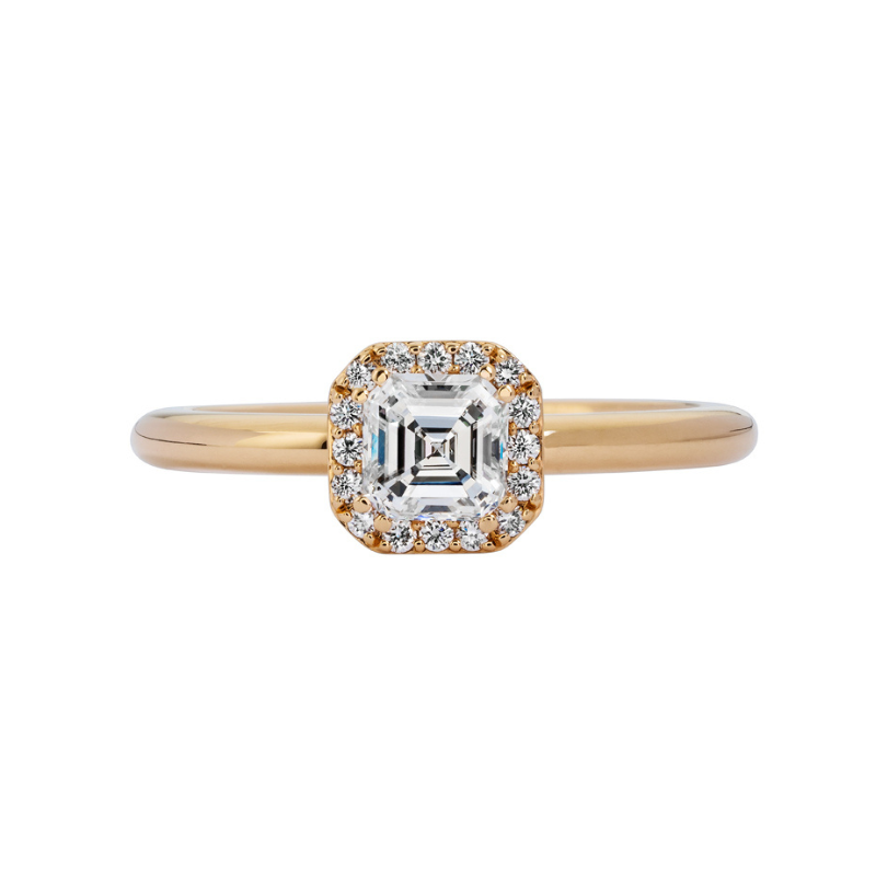 Carmoséring med Asscherslipad mittsten. Finns i vitguld och guld. Mittsten från 0,20 ct och uppåt. Kvalitet TW/VS.