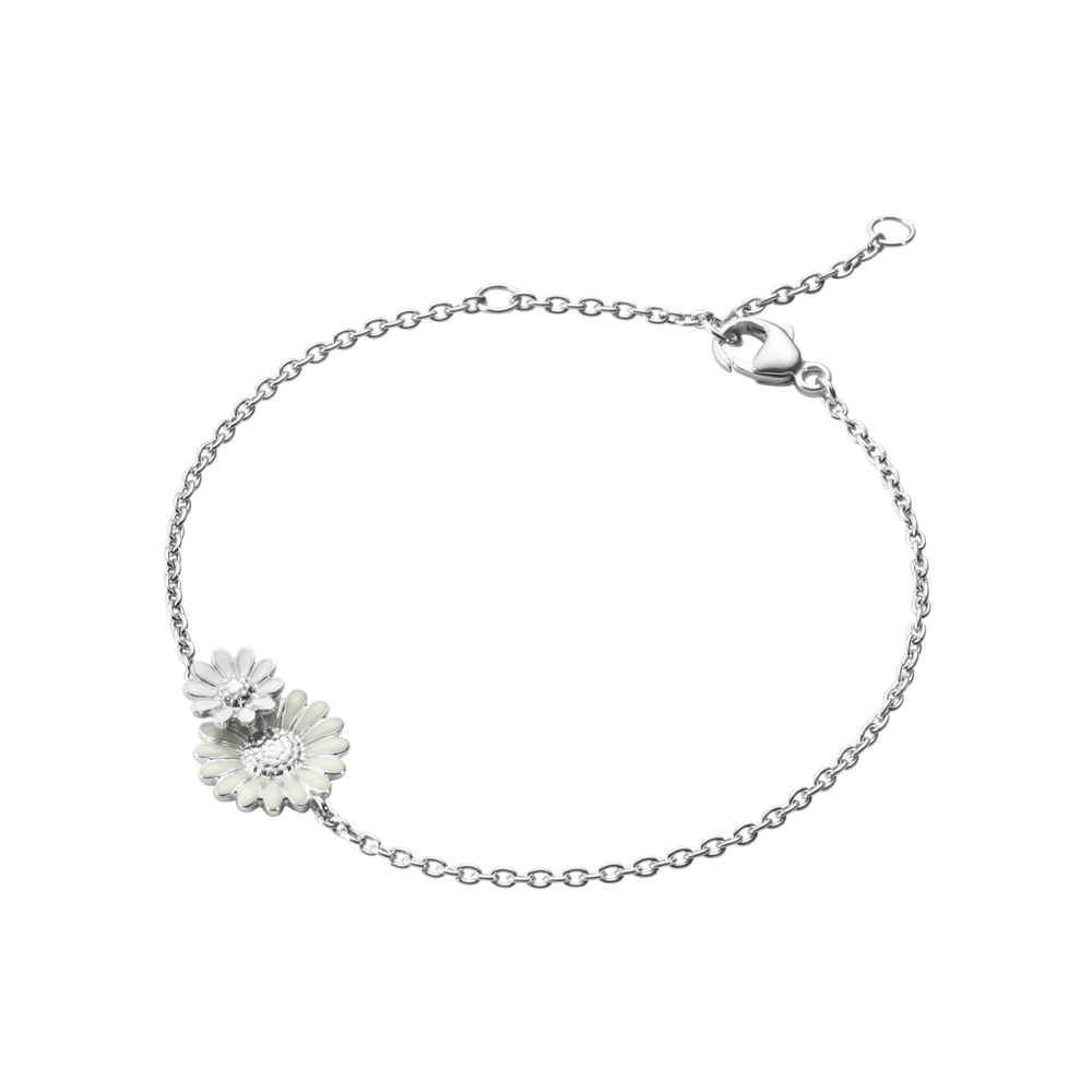 Daisy-armbandet i rodiumpläterat sterlingsilver är smakfullt avskalat med två tusenskönor i olika storlekar med handmålade kronblad i olika nyanser av vitt och en kedja i sterlingsilver. Armbandet är framtaget som en del av Daisy-kollektionen i samarbete med Stine Goya och är en uppfriskande twist på den ikoniska kollektionen från 1940-talet. Armbandet kan kortas för att passa handleden.