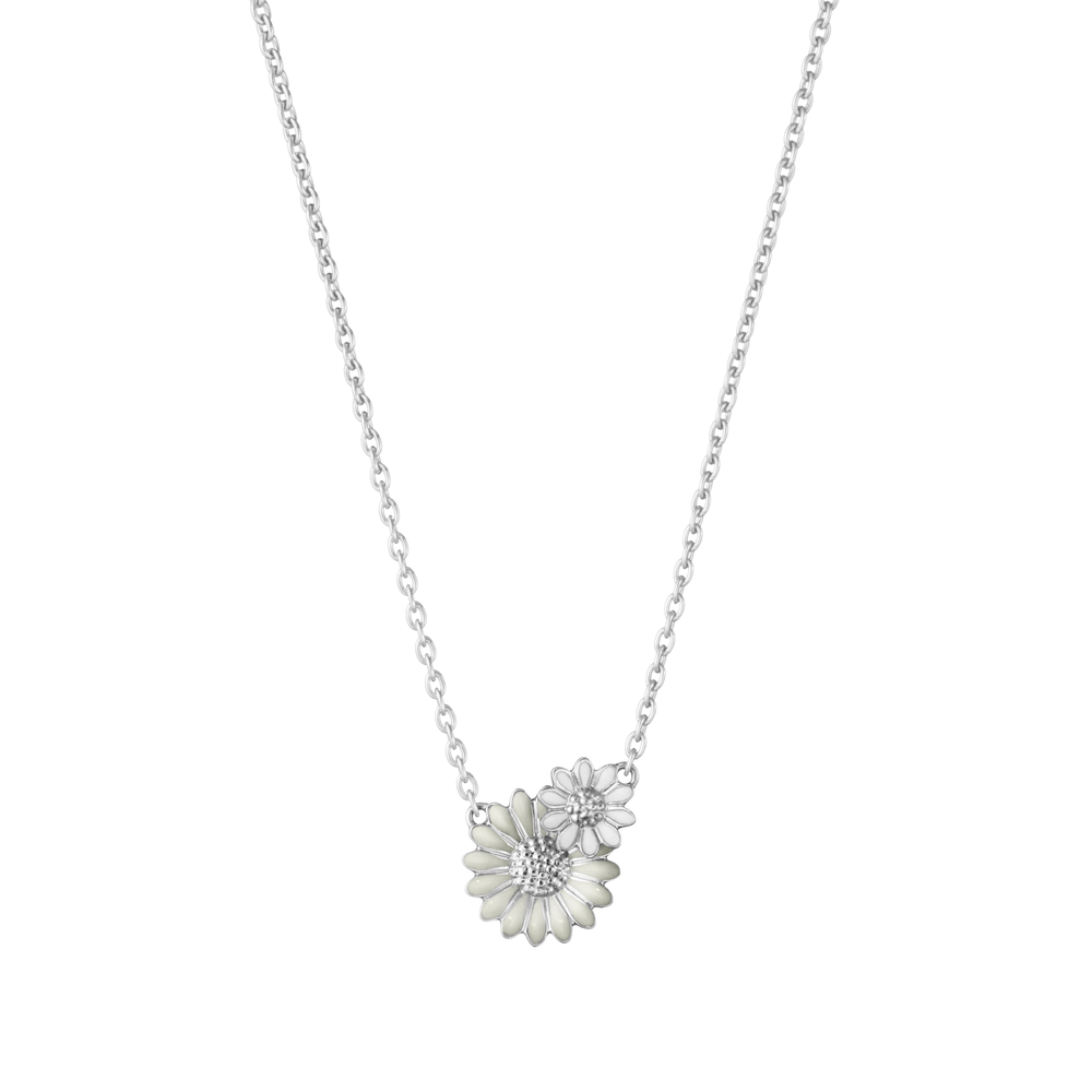 Daisy-hängsmycket i rodiumpläterat sterlingsilver är handmålat i olika nyanser av krämfärgat och vitt och är designat för att hänga elegant i ankarkedjan mot bärarens bröst. Ett tidlöst tillskott i alla smyckeskrin. Smycket är tillverkat i samarbete med den danska designern Stine Goya och refererar till Georg Jensens klassiska Daisy-kollektion från 1940-talet. Det kan kortas för att passa dina behov.