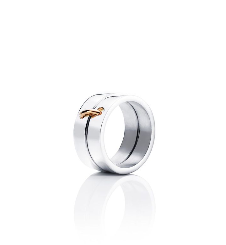 Två ringar i sterlingsilver som är sammanlänkade av en liten ring i 18k guld.