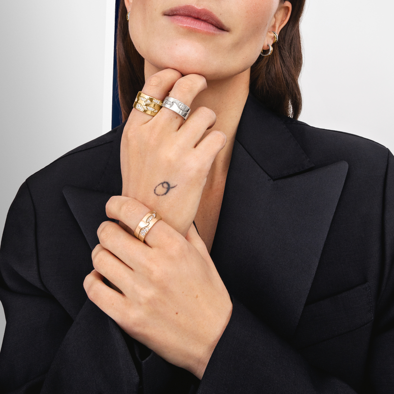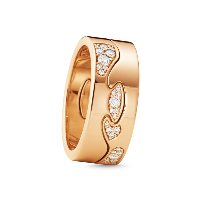 Den flytande, organiska formen hos den klassiska Fusion-ringen framhävs av pavéinfattade briljantslipade diamanter som framträder som moln mot den polerade bakgrunden på den här ytterringen i 18 karat roséguld. Kombinera med andra Fusion-ringar för att skapa ett individuellt smycke som bäst speglar din personlighet. Observera att molnmönstret skiljer sig åt mellan två Fusion-ytterringar (AA och AB). Se till att para ihop en av varje (AA och AB) när du kombinerar Fusion-ytterringar så att diamanterna är vända åt samma håll när de bärs tillsammans
