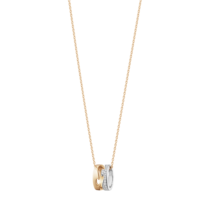 Detta utsökta och eleganta hängsmycke består av två Fusion-miniringar i 18 karat roséguld och vitt guld med pavéinfattade diamanter. Designen är en lätt och modern tolkning av det klassiska Fusion-mönstret.