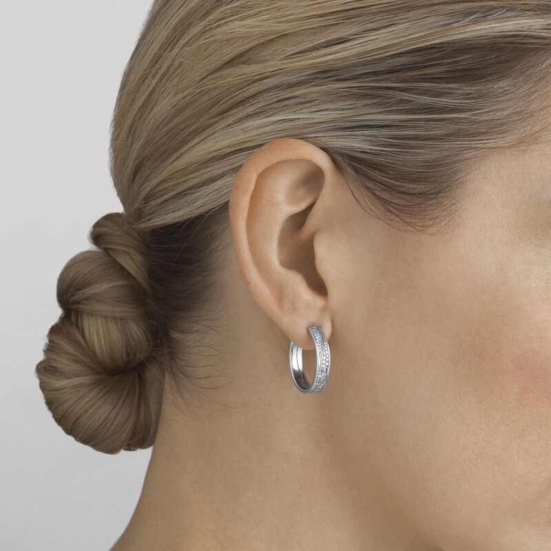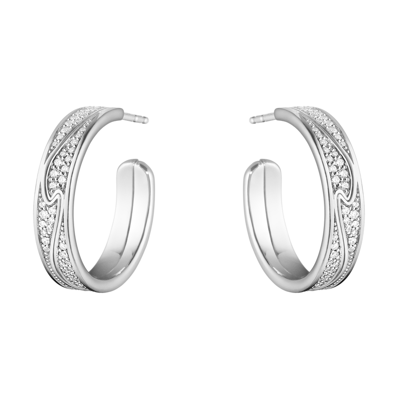 De här vackra örhängena i 18 karat vitt guld med pavéinfattade diamanter uppvisar både yrkesskicklighet och klassisk skandinavisk design. Den perfekta presenten till någon du älskar. Örhängets organiska form representerar två halvor som förenas och skapar en perfekt helhet – en symbol för äkta kärlek.