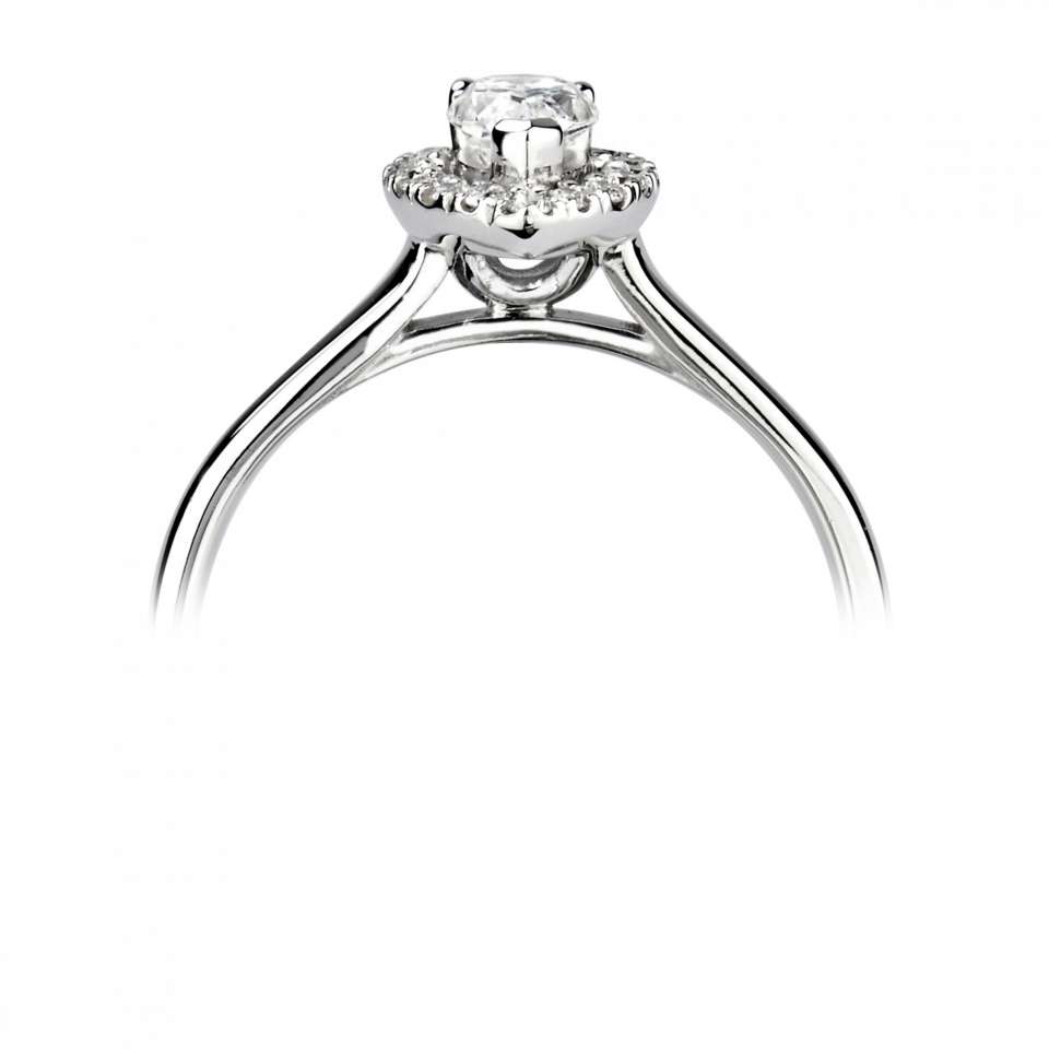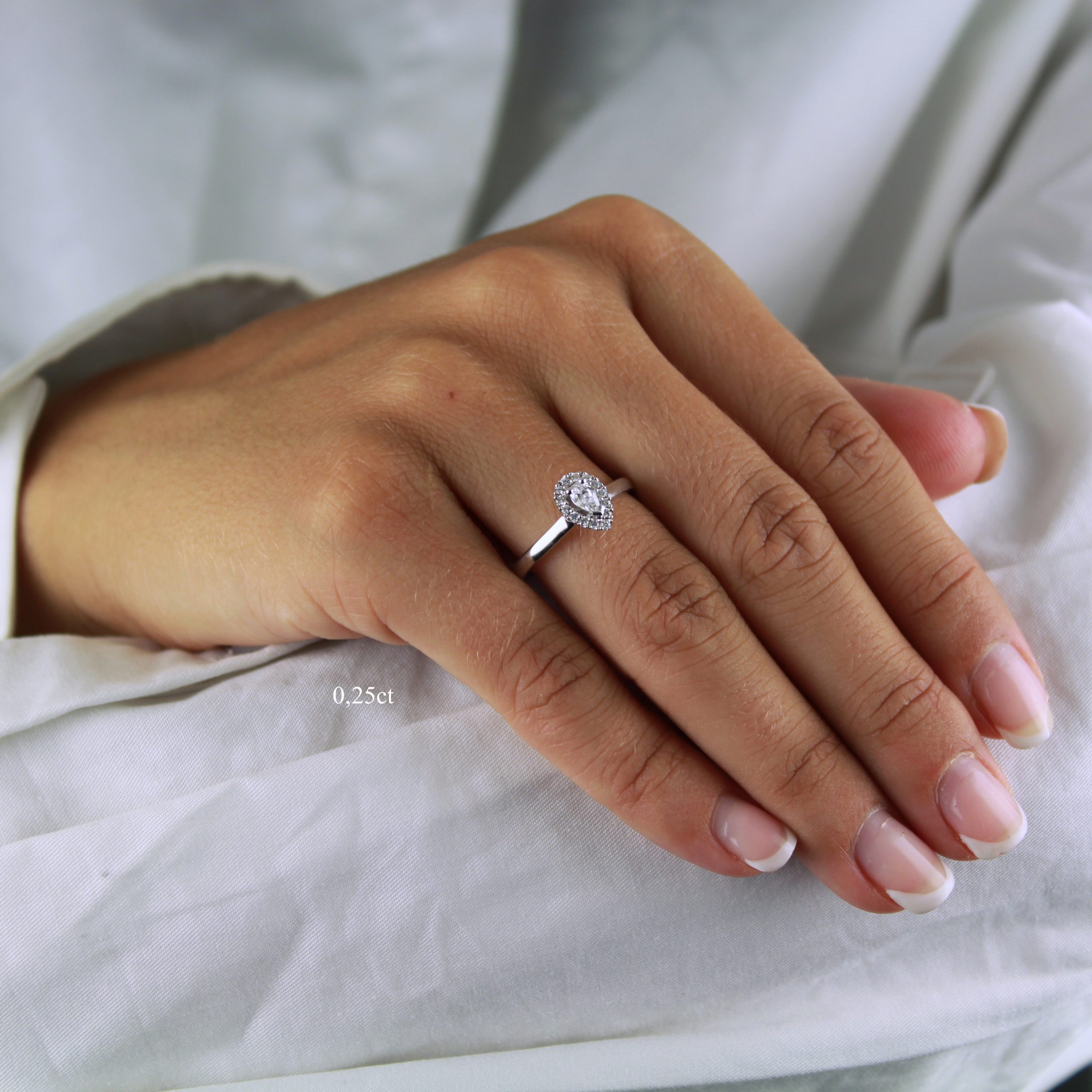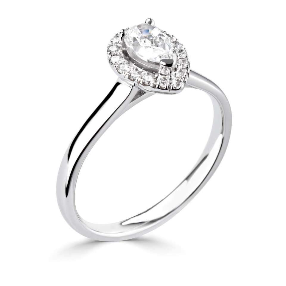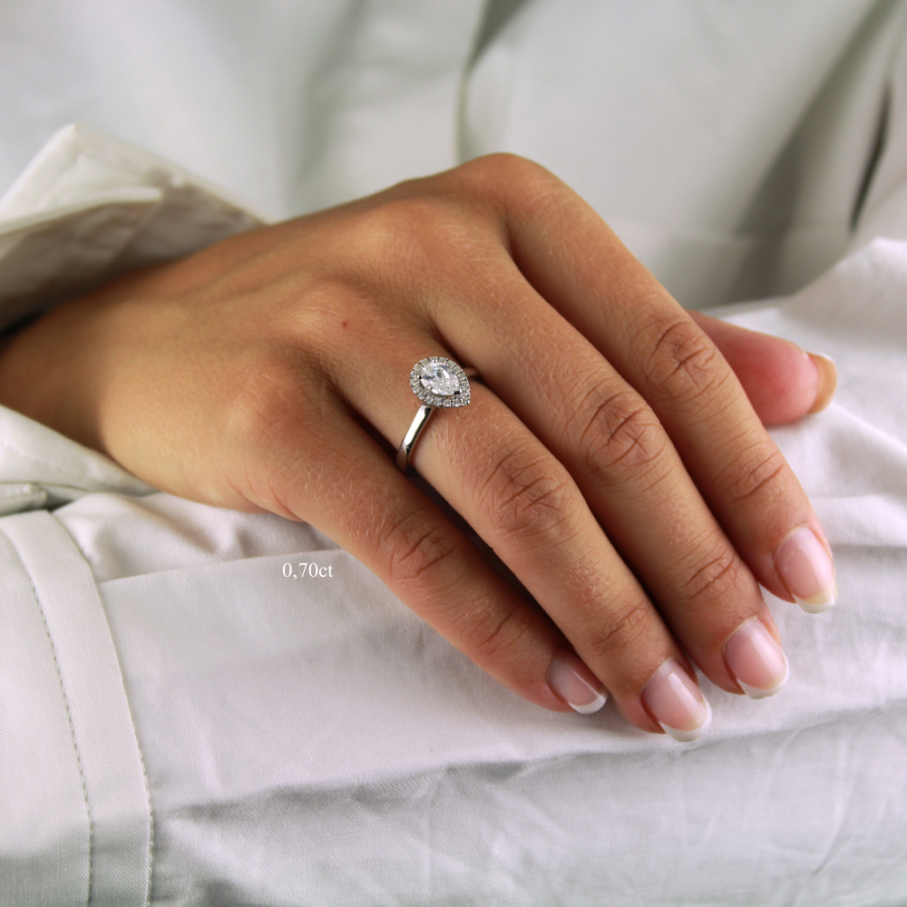 Vacker och modern halomodell med en päron/ droppslipad mittsten.