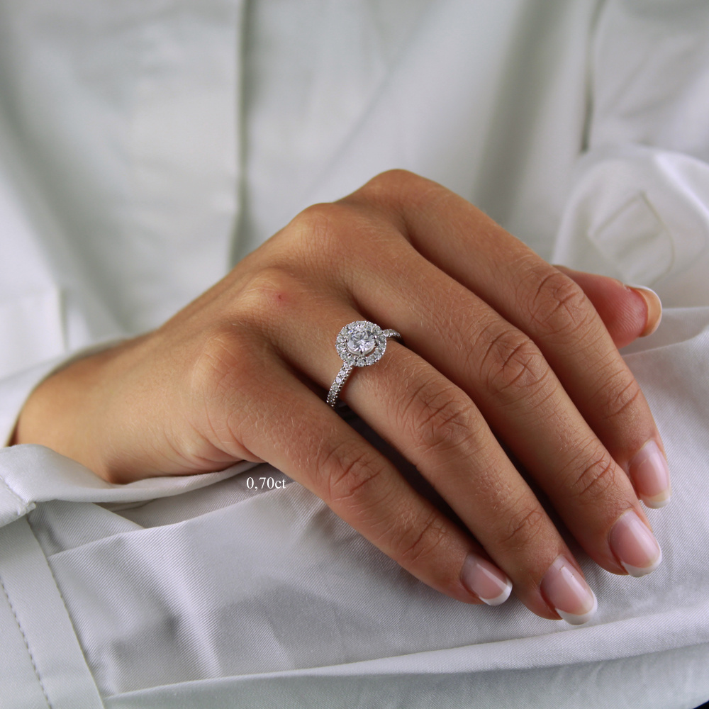 | 0,70ct mittsten | Halo/sidostenar 0,56ct naturliga diamanter |