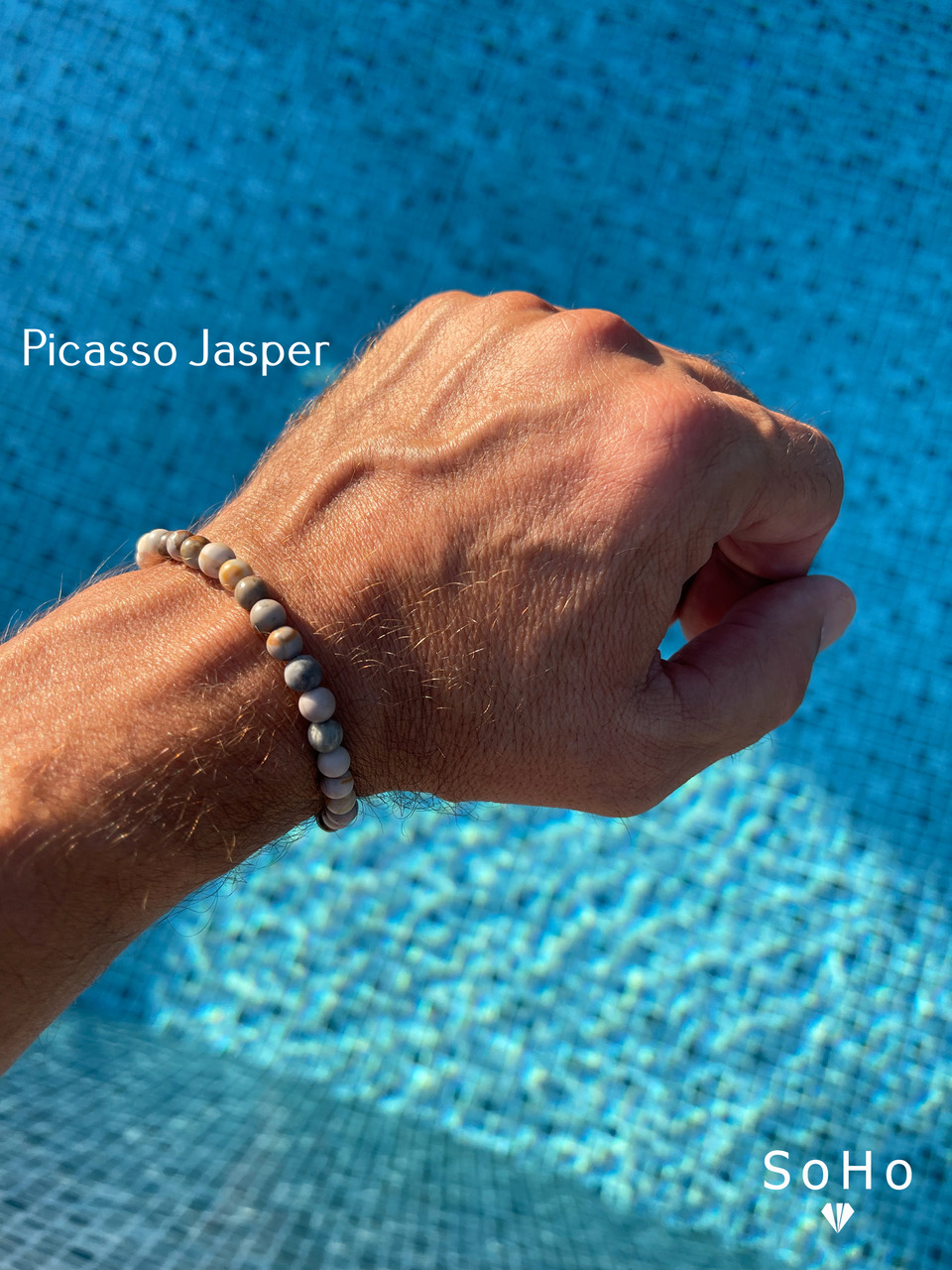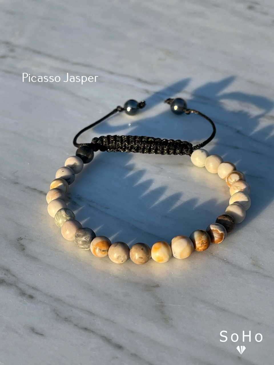 6mm Picasso Jasper stones with Hematite stones at locker. Adjustable size.