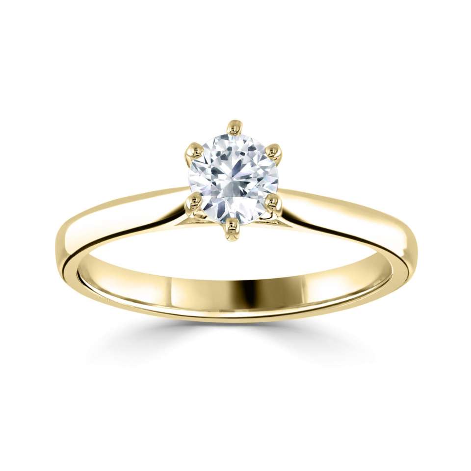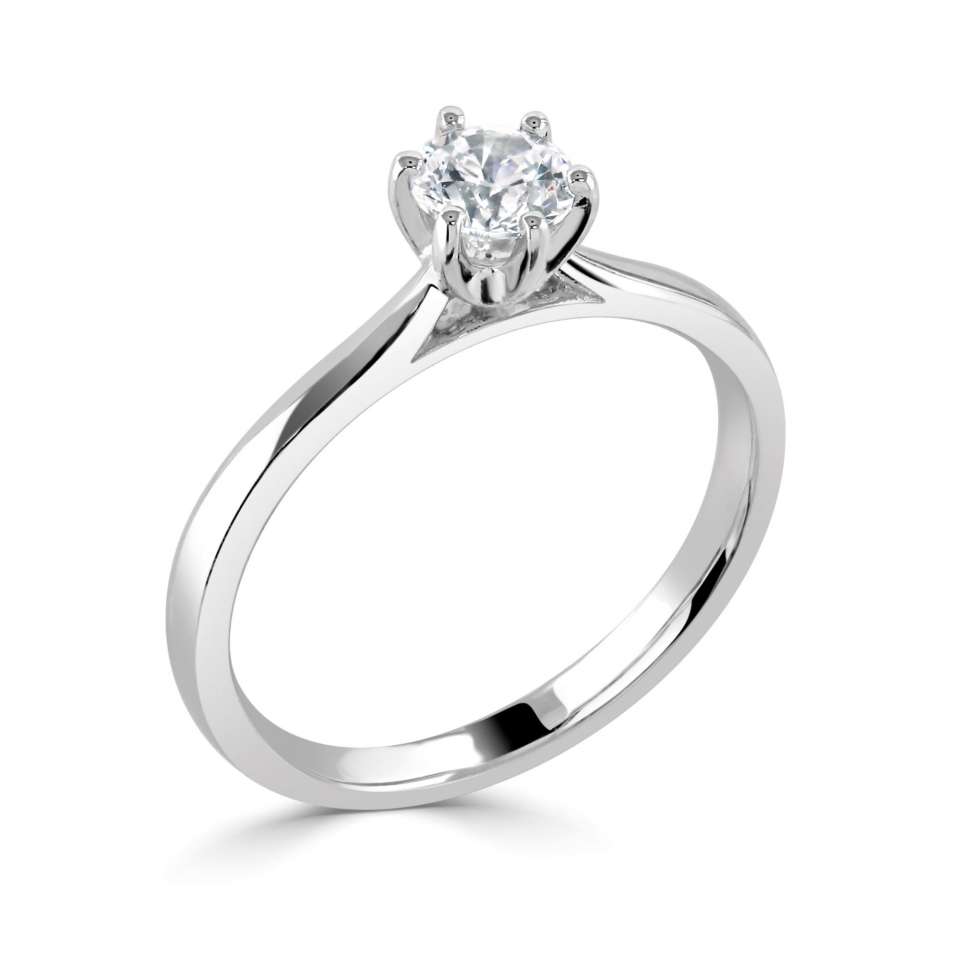Kensington är vår fantastiska solitärring med 6 klor och en härligt rundad skena, tillverkad av återvunnet guld eller platina.