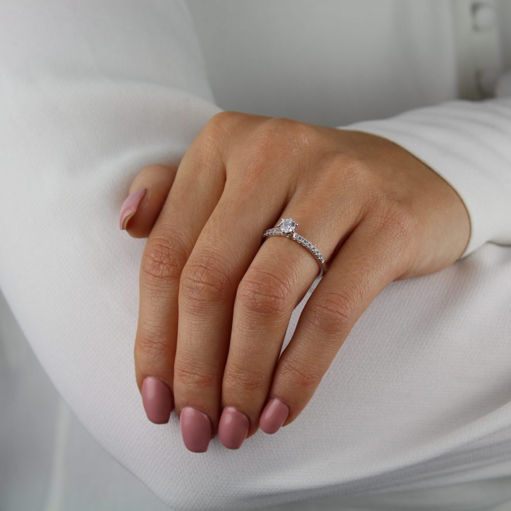 Lilly är en klassisk och nätt solitärmodell med 6 klor . Fishtailinfattade sidostenar.