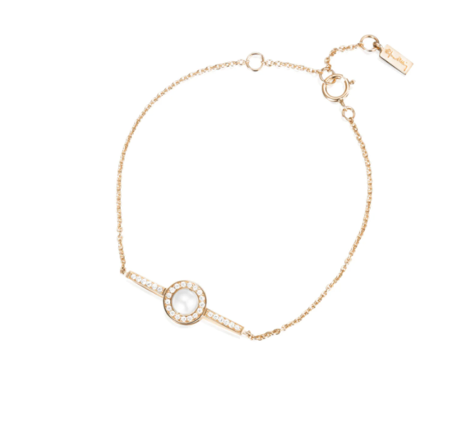 Armband i 18k guld med sötvattenpärla inringad av briljantslipade diamanter i en välvd båge på mitten av kedjan.