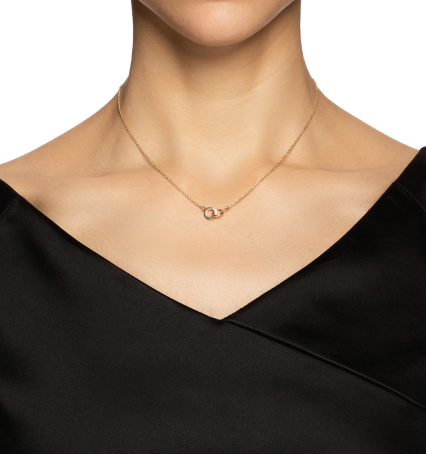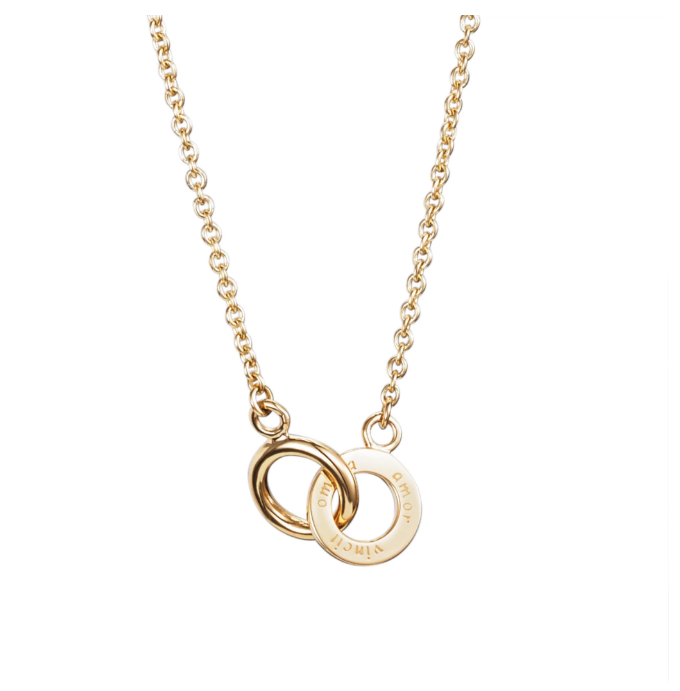 Halsband i 18k guld med två sammanlänkade ringar. En rundad ring och en kantig graverad med orden Amor Vincit Omnia – kärleken övervinner allt på latin