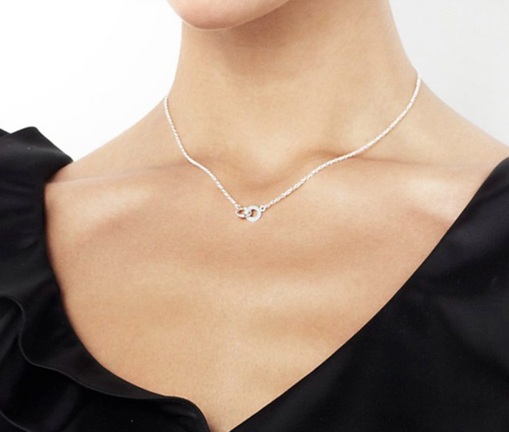 Halsband i sterlingsilver med två sammanlänkade ringar. En rundad ring och en kantig ring graverad med orden Amor Vincit Omnia – kärleken övervinner allt på latin.