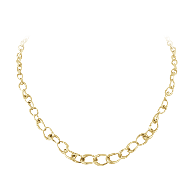 Offspring halsband i guld är designat av Jacqueline Rabun och består av en rad sammanlänkade ovala länkar i olika storlekar som leker med perspektivet. Smycket är tillverkat i 18 karat guld och har en hänglänk baktill som fungerar som en liten berlock.