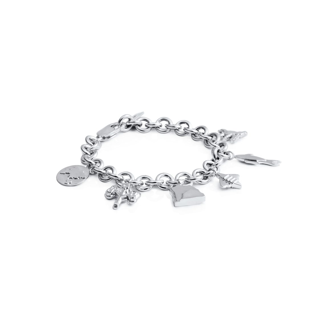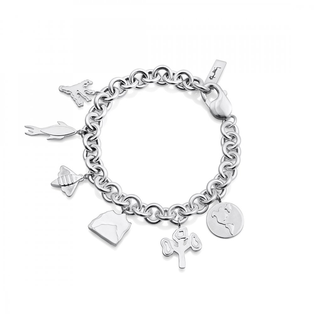Kraftigt armband i sterlingsilver med hängande symboler i form av jordglob, träden i Amazonas, Antarktis isberg, bi, fisk och korallrev.