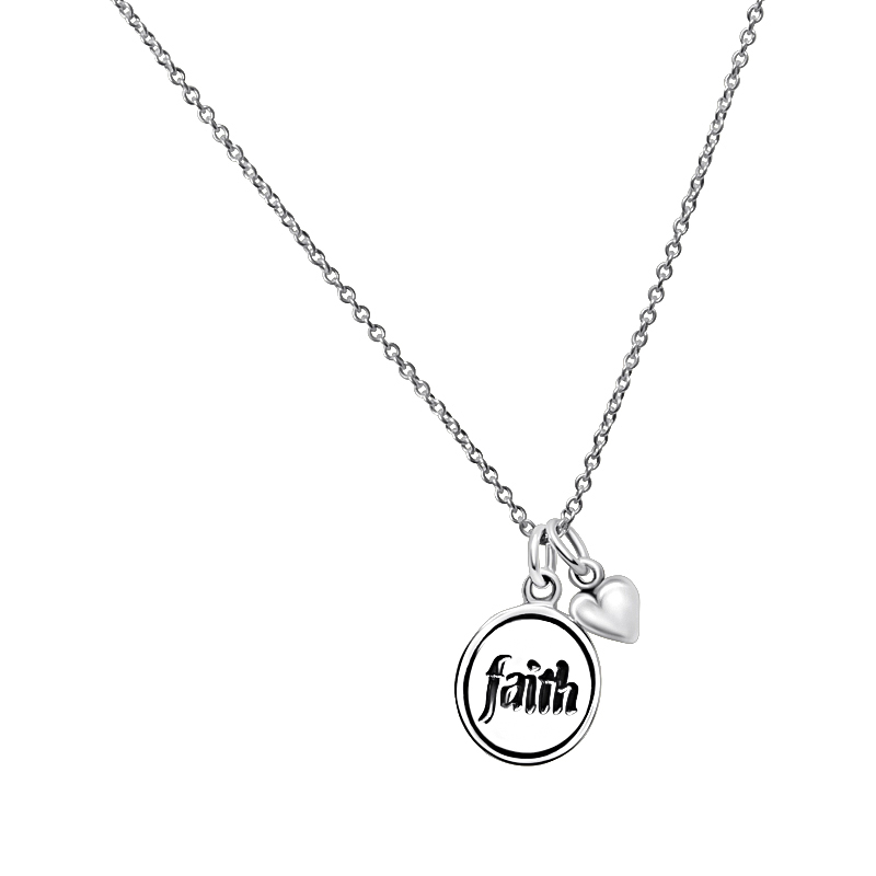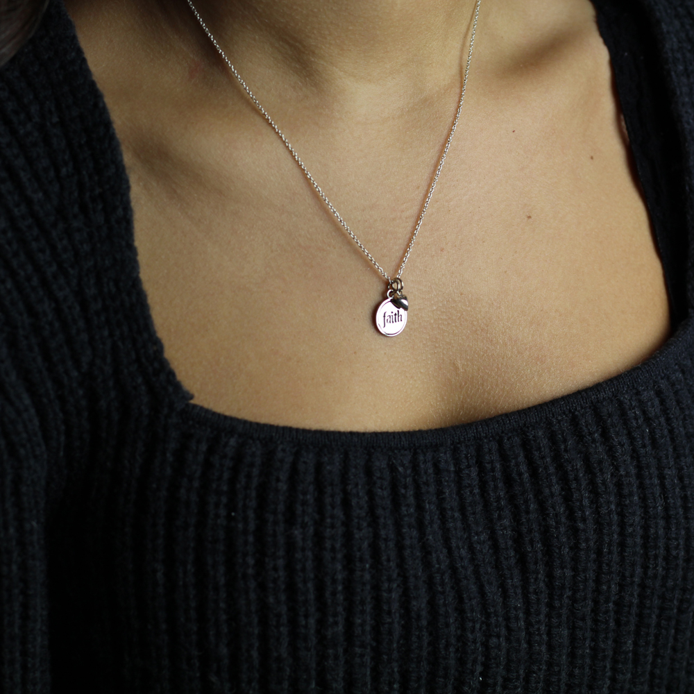 Halsband med text ”Faith” och ett litet hjärta i äkta silver. Kedja ingår.