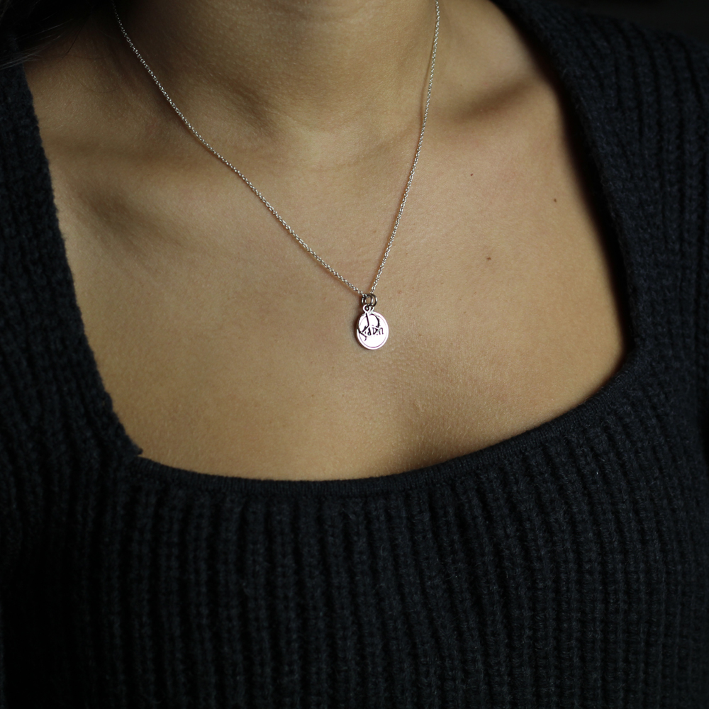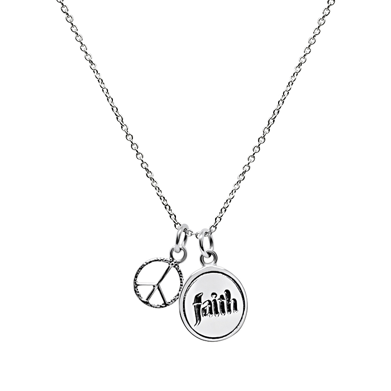 Halsband med peacesymbol och platta med text ”faith” i äkta silver. Kedja ingår.