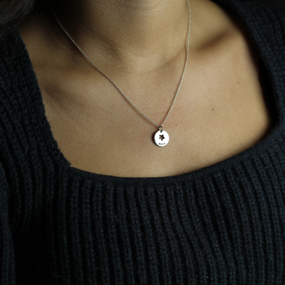 Halsband med utstansad stjärna och text ”wish” i äkta silver. Kedja ingår.