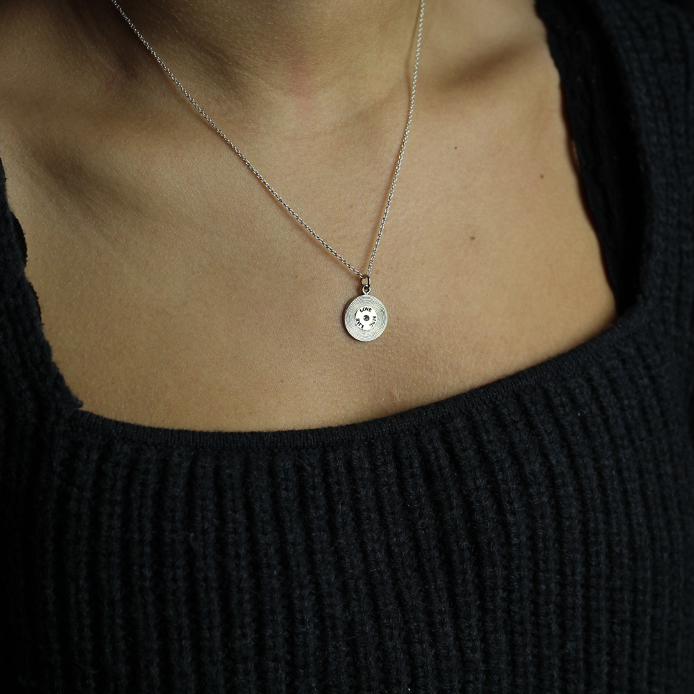 Halsband i form av vinylskiva och text ”Live Love Sing” i äkta silver med en vit syntetsten i mitten. Kedja ingår.