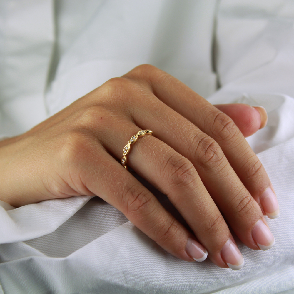 En vacker och romantisk navetteformad alliansring i 18k guld.