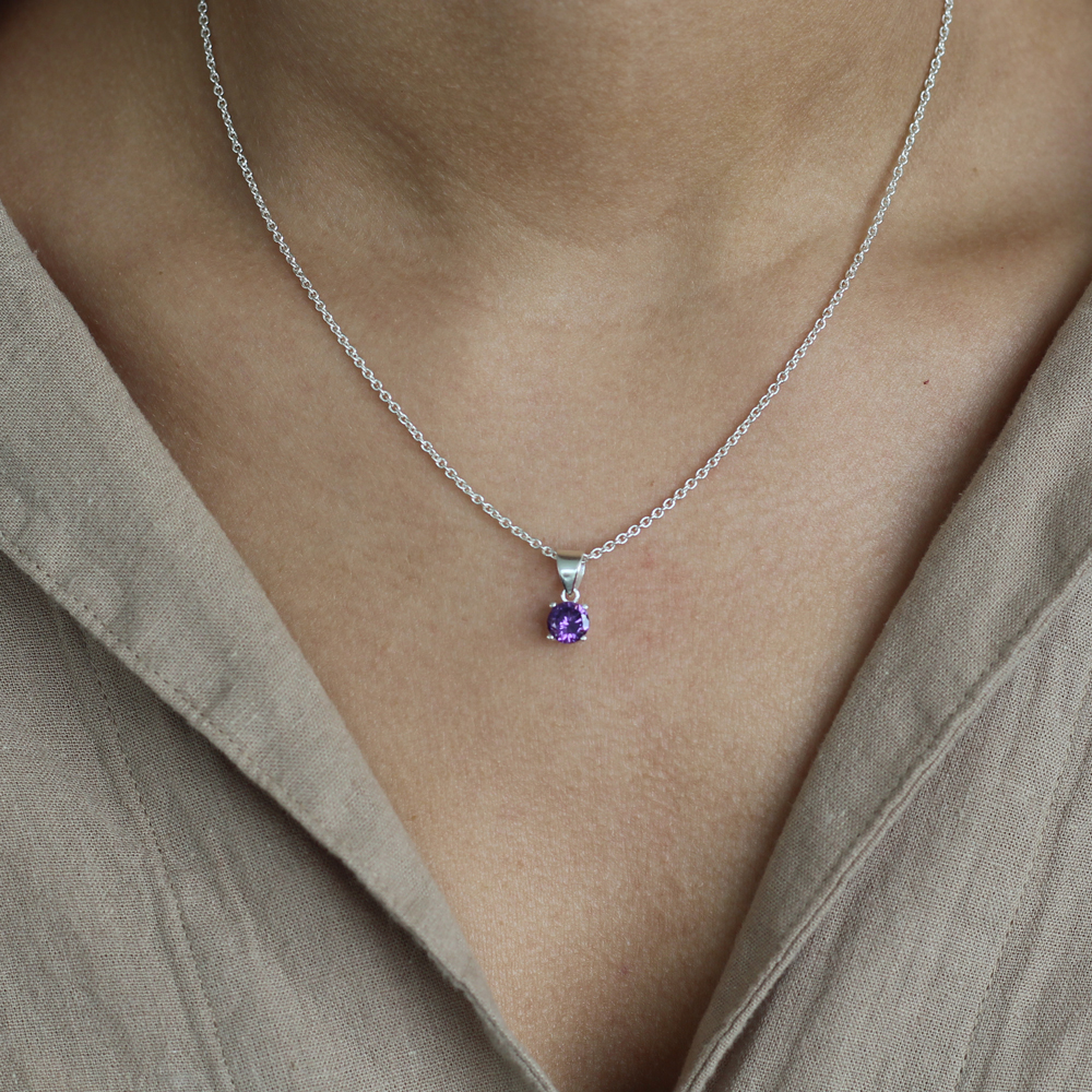 Lilafärgad cubic zirkonia rundslipad, omsluten av äkta silver.