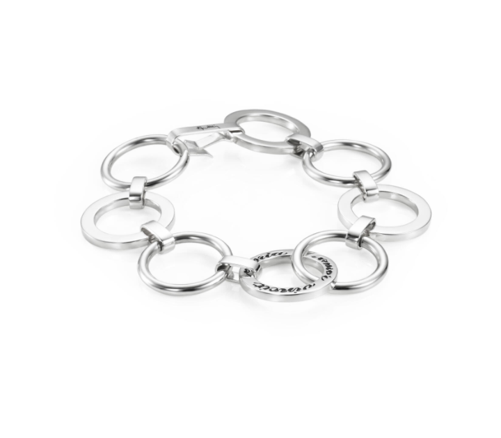 Armband i sterling silver graverat med orden Amor Vincit Omnia, ”Kärleken övervinner allt” på Latin. Mittendelen är stel medan resterande ringar är rörliga.